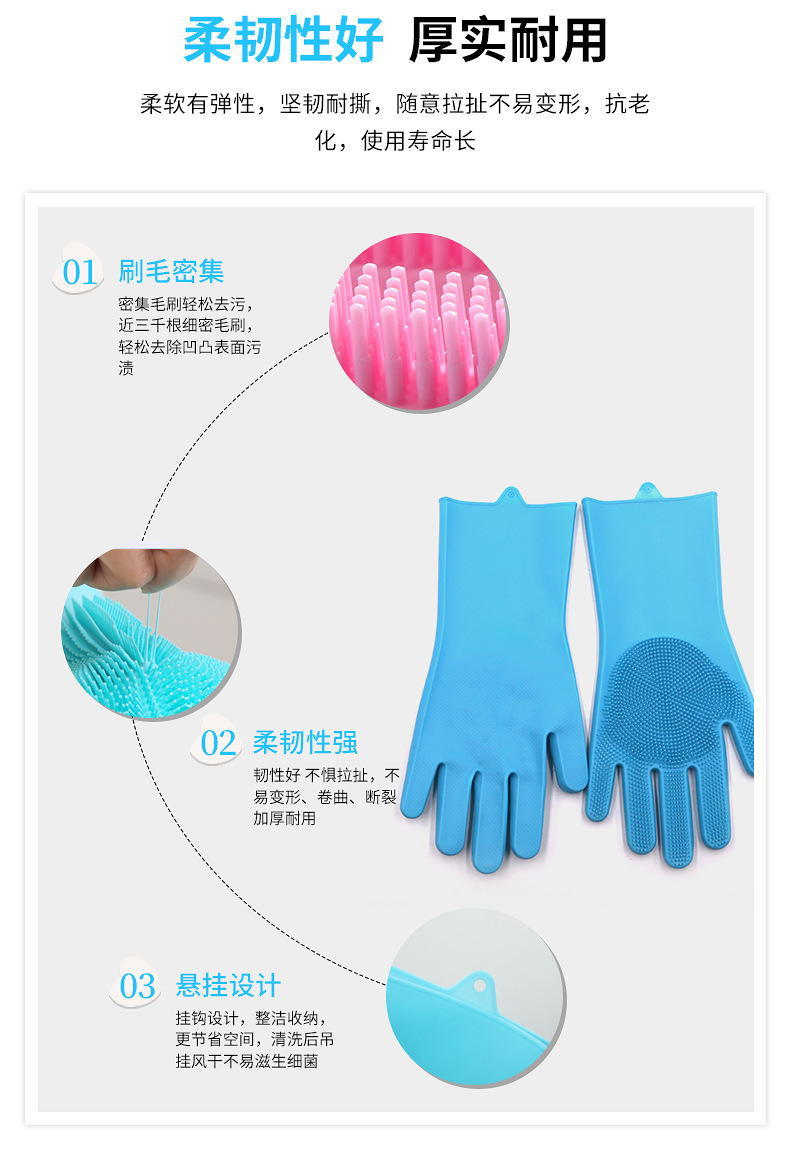 3.手套易清洗徹底不滋生細菌,這一點是很多清潔用品都做不到的,油脂、醬油、醋、污垢等等都無法有力附著在硅膠表面,而其他比如鋼絲球、海綿塊、洗碗布等等材質,都做不到,使用硅膠洗碗手套實在是讓人放心。