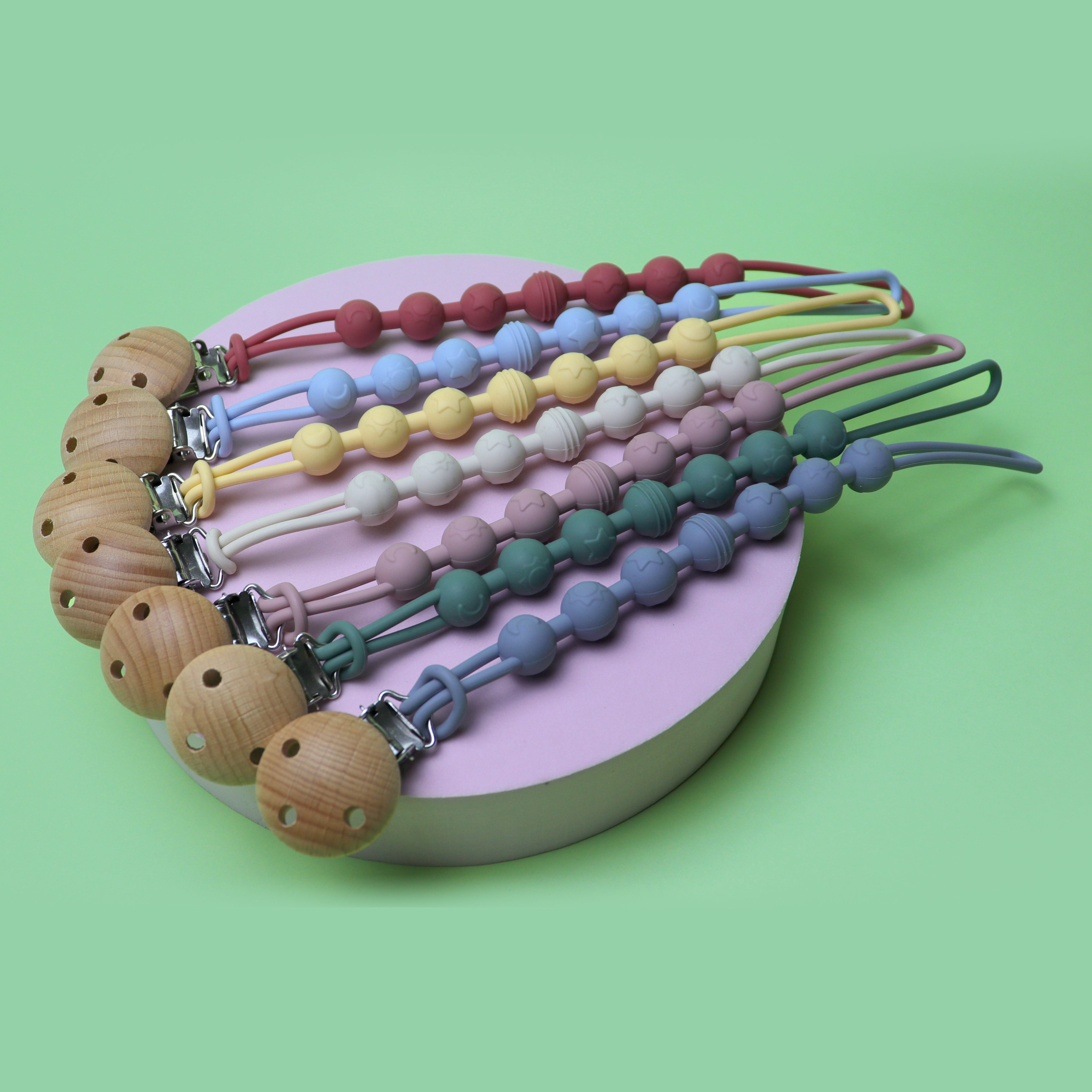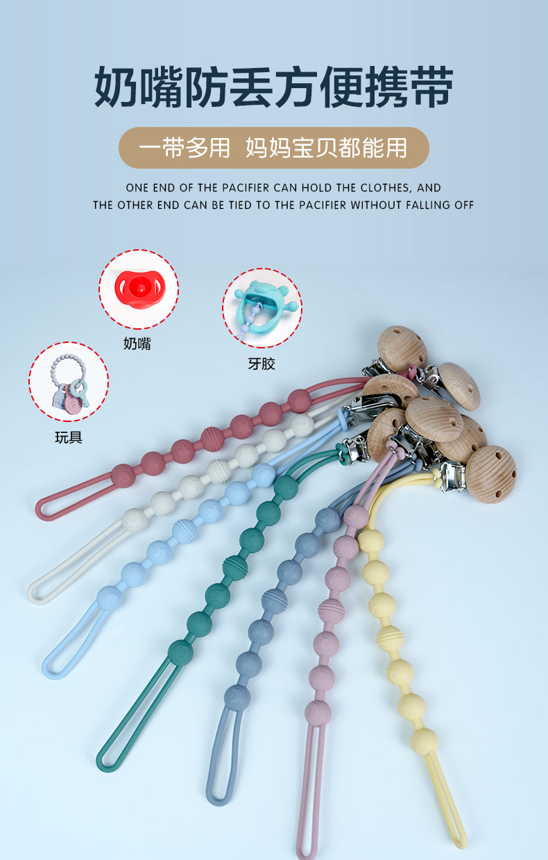 材質(zhì):硅膠奶嘴鏈+櫸木夾子