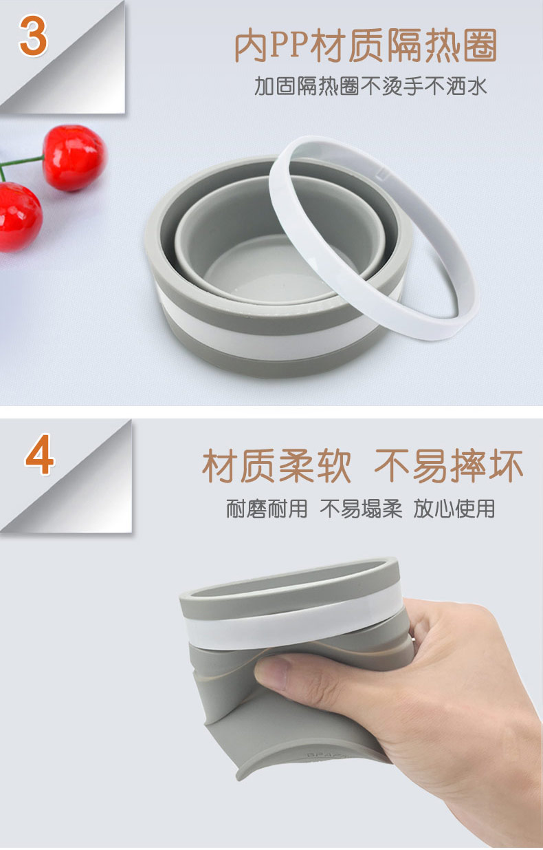 折疊式硅膠水杯成為運動以及郊游的便攜物品之一,水喝完后直接折疊放入口袋減小儲物空間替代了對水壺和瓶裝礦泉水的不足, 完全顛覆了消費者對硅膠折疊水杯的看法,硅膠折疊杯是一種攜帶方便、使用衛(wèi)生、具有雙層杯壁的折疊杯。外壁的兩個相鄰段通過螺紋連接,內(nèi)壁的兩個相鄰段為錐形配合,可上下移動。通過外壁螺紋旋轉(zhuǎn)驅(qū)動內(nèi)壁上下展開,實現(xiàn)杯形折疊和拉伸動能。